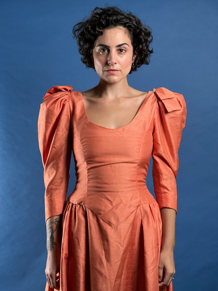 Vintage original 1980s organza peach maxi dress, beautiful details, puffy sleeves and big bow on the back.
