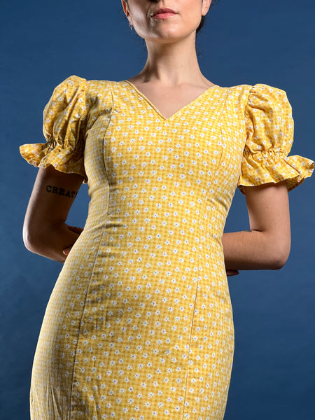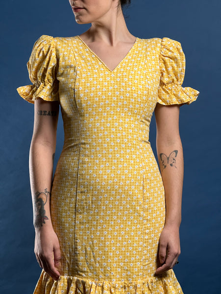 Beautiful and Rare, vintage original 1970s cottagecore prairie yellow maxi dress, with beautiful floral design, amazing fringe ag the end and details on the sleeves. This one is a special one, perfect for boho, hippie days.